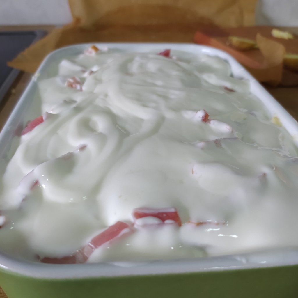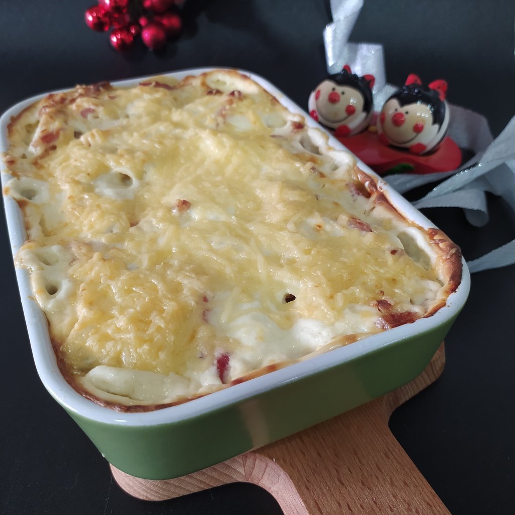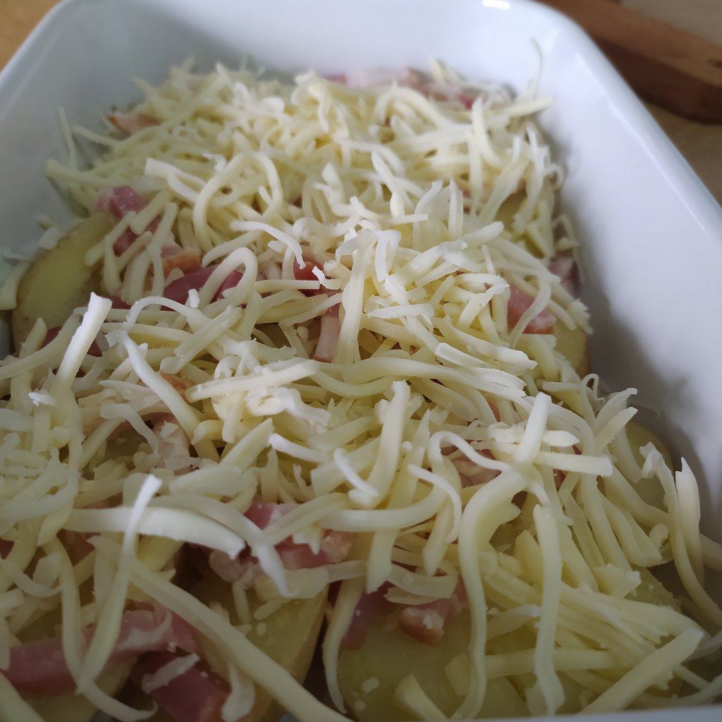 - Puedes añadir puerro o cebolla partido en juliana y salteado entre las capas de la patata. O bien, bacon ahumado en tiras.