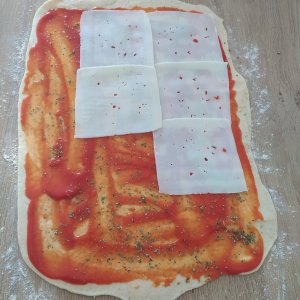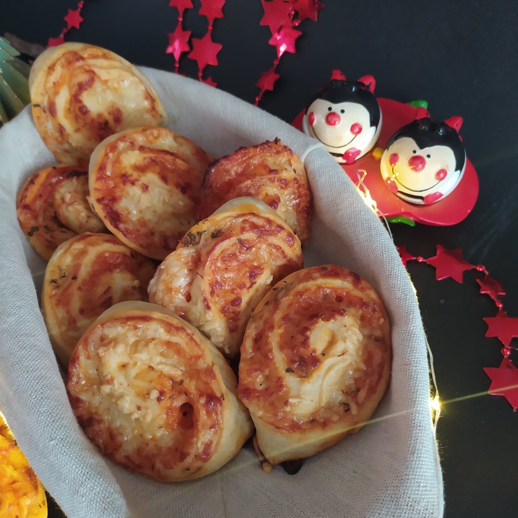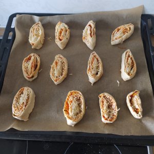 - Estirar la masa formando un rectángulo, repartir por encima la salsa de tomate con el orégano molido y poner encima el queso. Enrollar con papel film y llevar al congelador media hora para cortar mejor, sacar y hacer rebanadas. Ir poniéndolas en una bandeja de hornear y dejar levar tapado hasta doblar.
