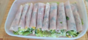- Jamón york, 1 lata de atún, 2 huevos duros y 1 cucharada de mayonesa. (Canelones de jamón york)