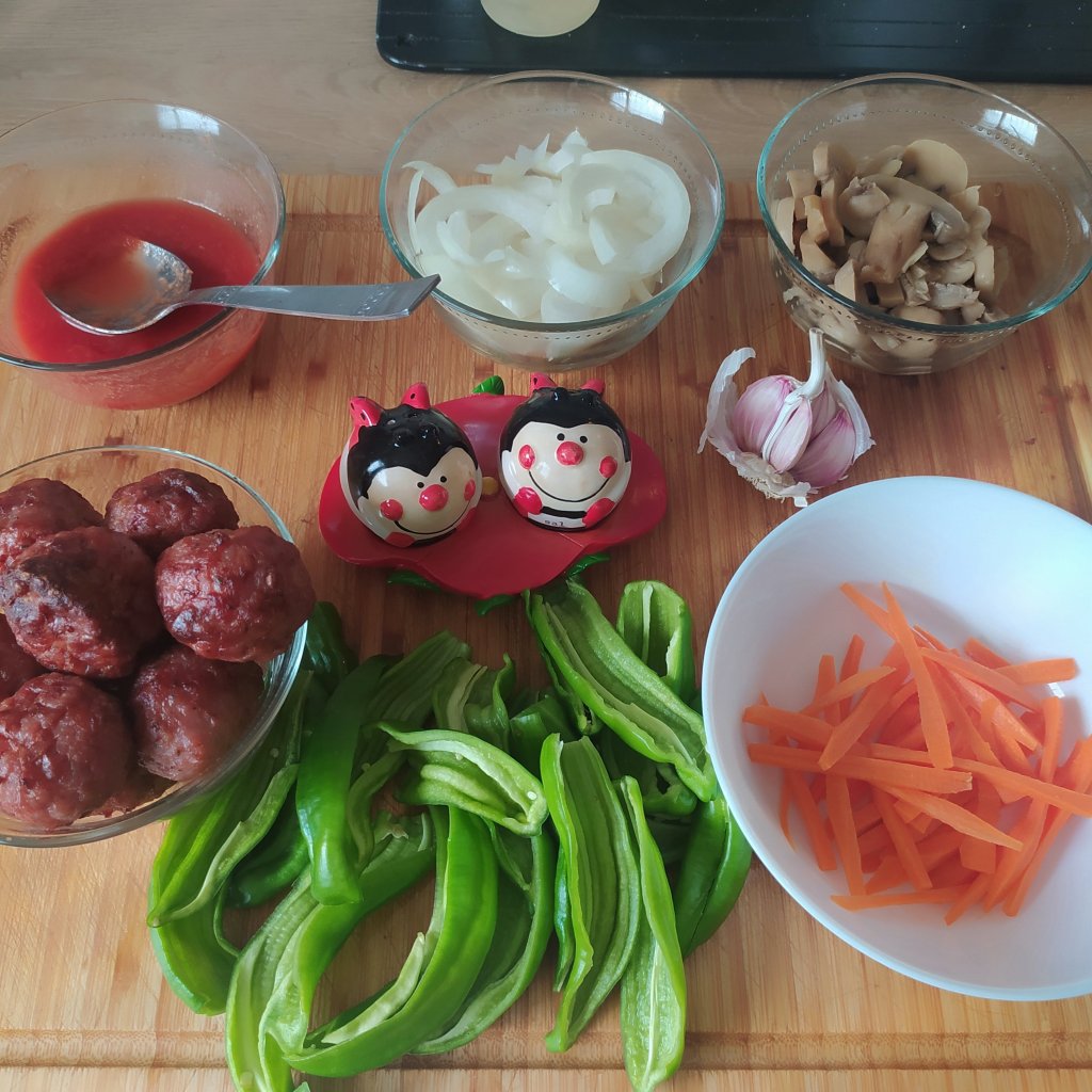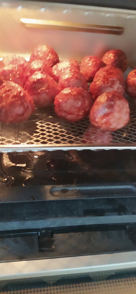 - 10 albóndigas ya cocinadas( en mi caso las hice en la freidora de aire pero puedes hacerlas en la sartén o al horno, como mas te gusten.)