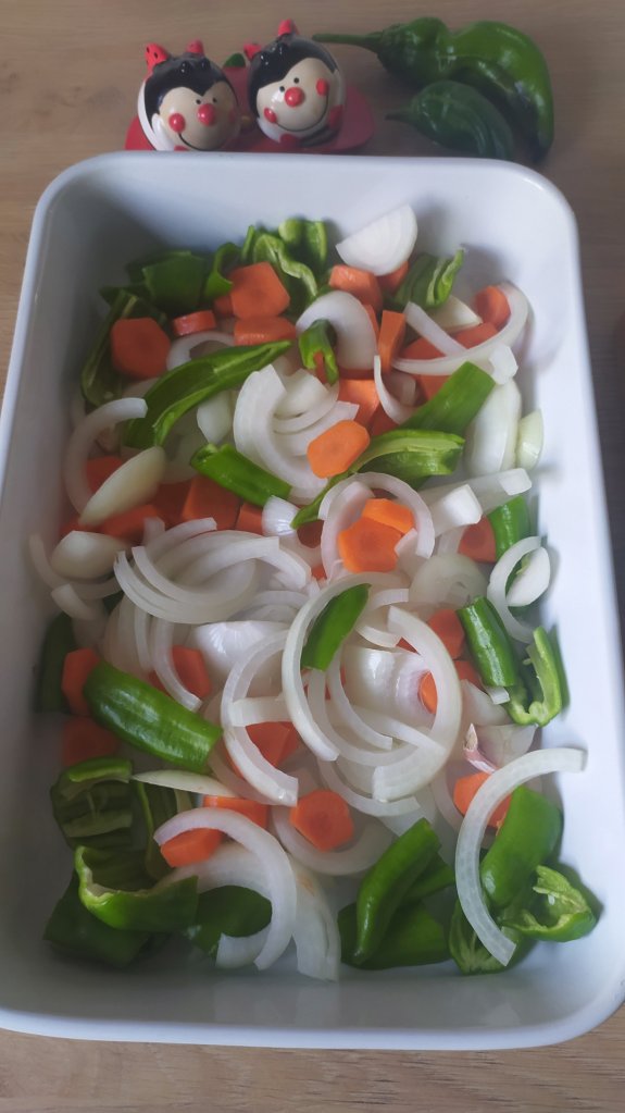 - Lavamos, pelamos y cortamos la verdura mientras ponemos el horno a calentar y las ponemos en una fuente apta para el horno.
