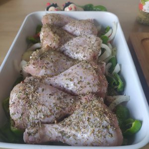 - Salamos las verduras y ponemos los muslos encima. Les ponemos sal, especias y aceite de oliva virgen extra.