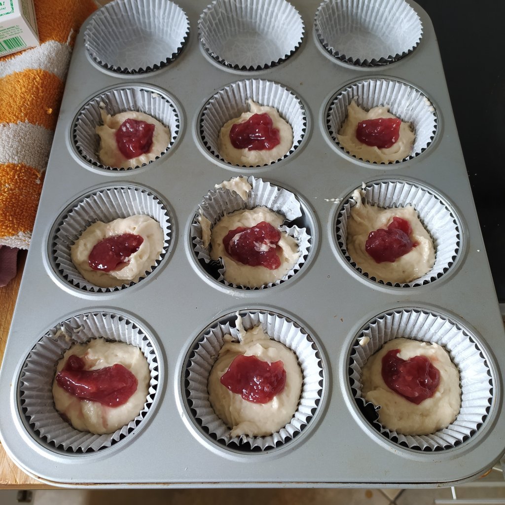 - Poner en los moldes engrasados una capa de masa, poner encima una cucharada de mermelada y tapar con el resto de masa.