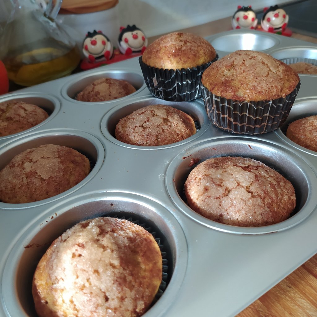 - Pasamos a los moldes, espolvoreamos un poco de azúcar por encima y metemos al horno precalentado 180º durante 15 minutos.