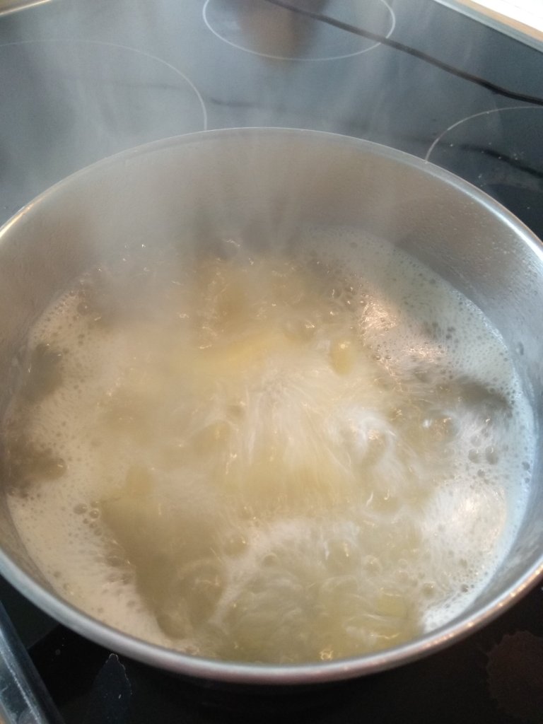 - Ponemos a hervir las patatas en un cazo con agua y sal hasta que estén blandas.