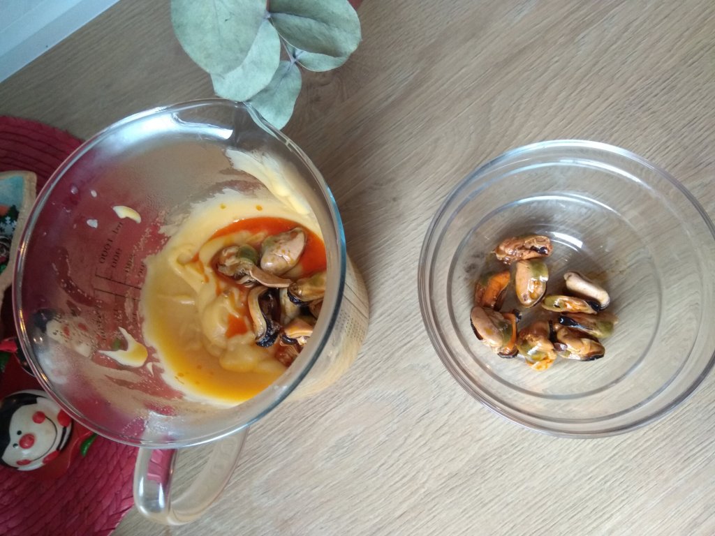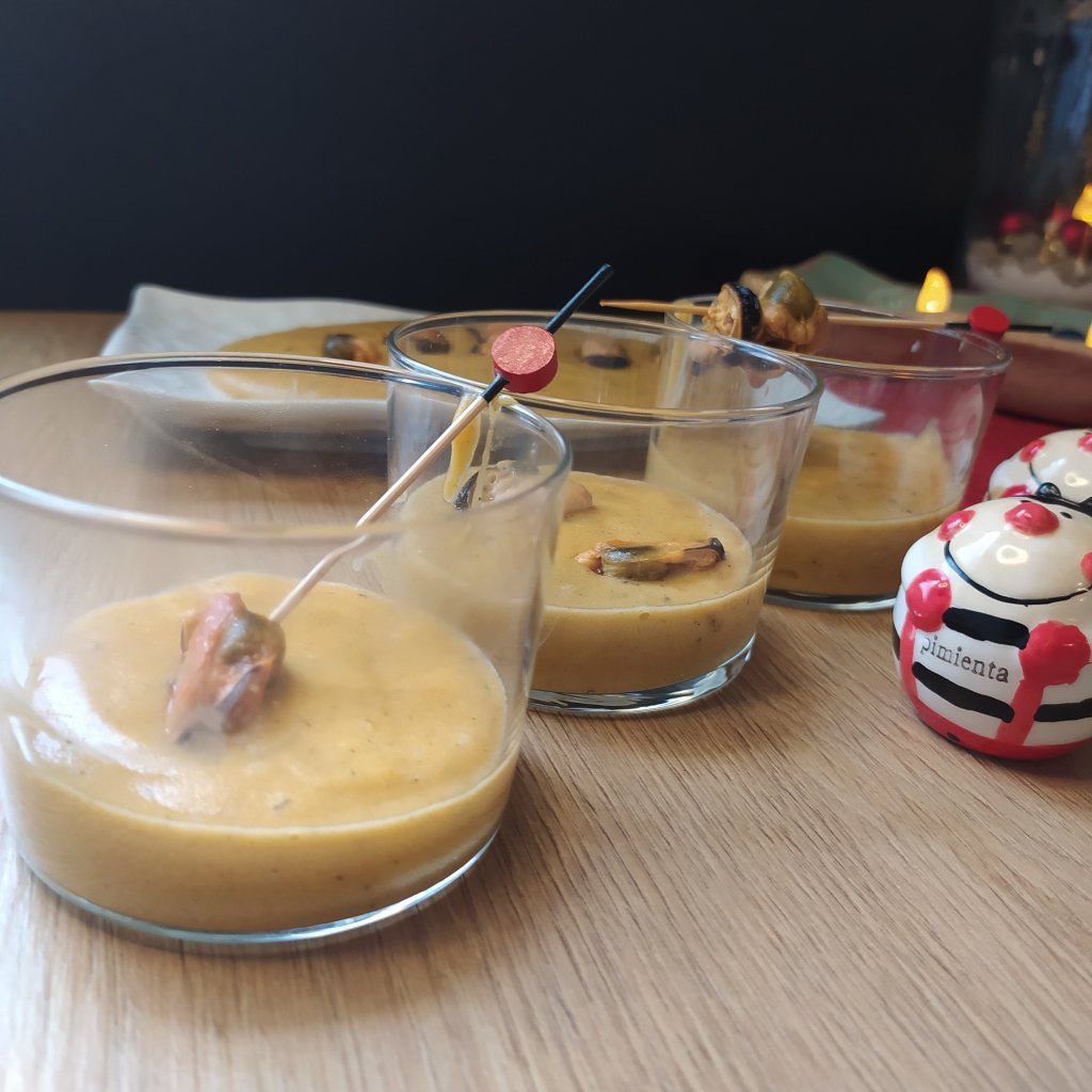 - Repartimos la crema en 6 vasitos y decoramos con dos mejillones cada uno. También puedes ponerlo en una fuente y que se sirvan en un plato.
