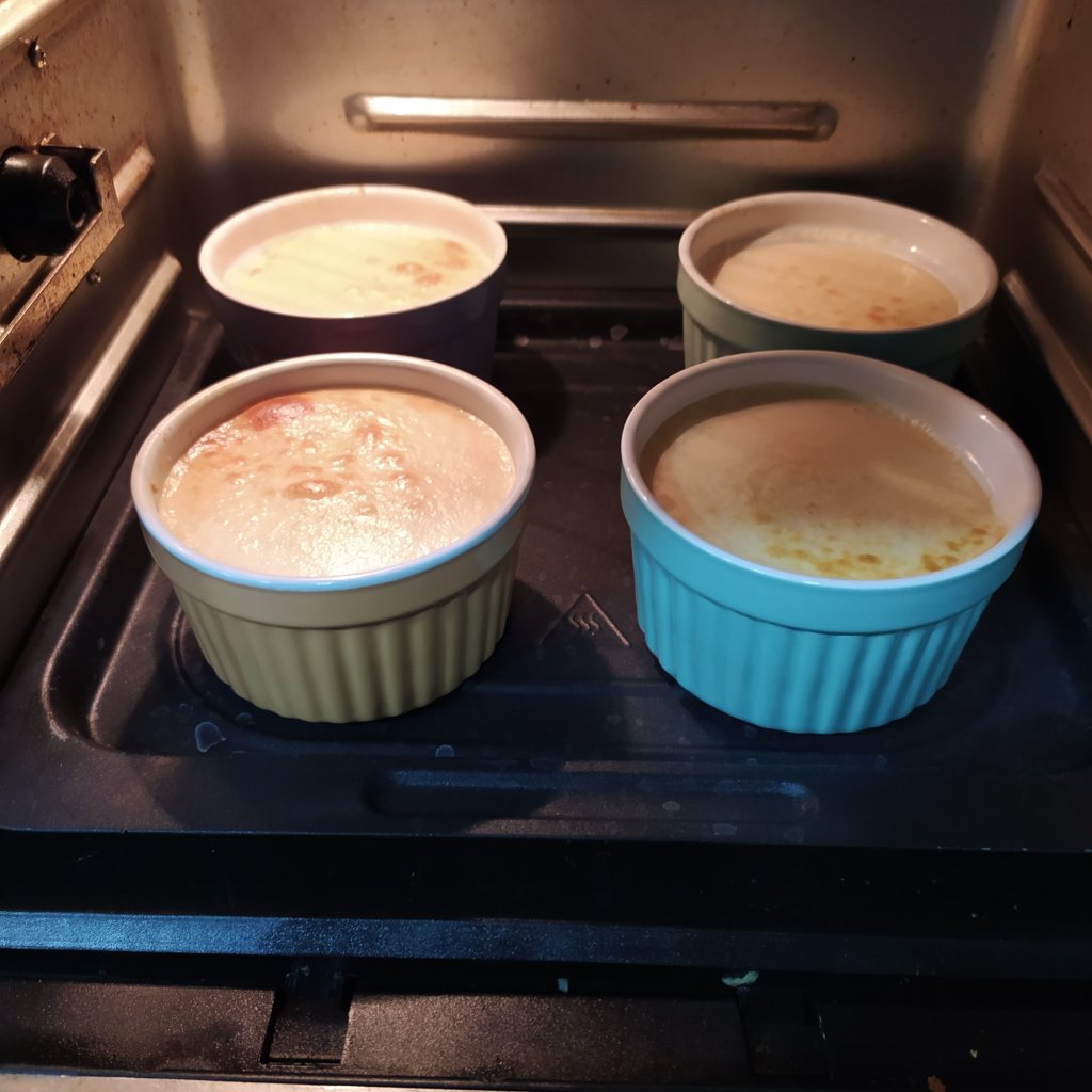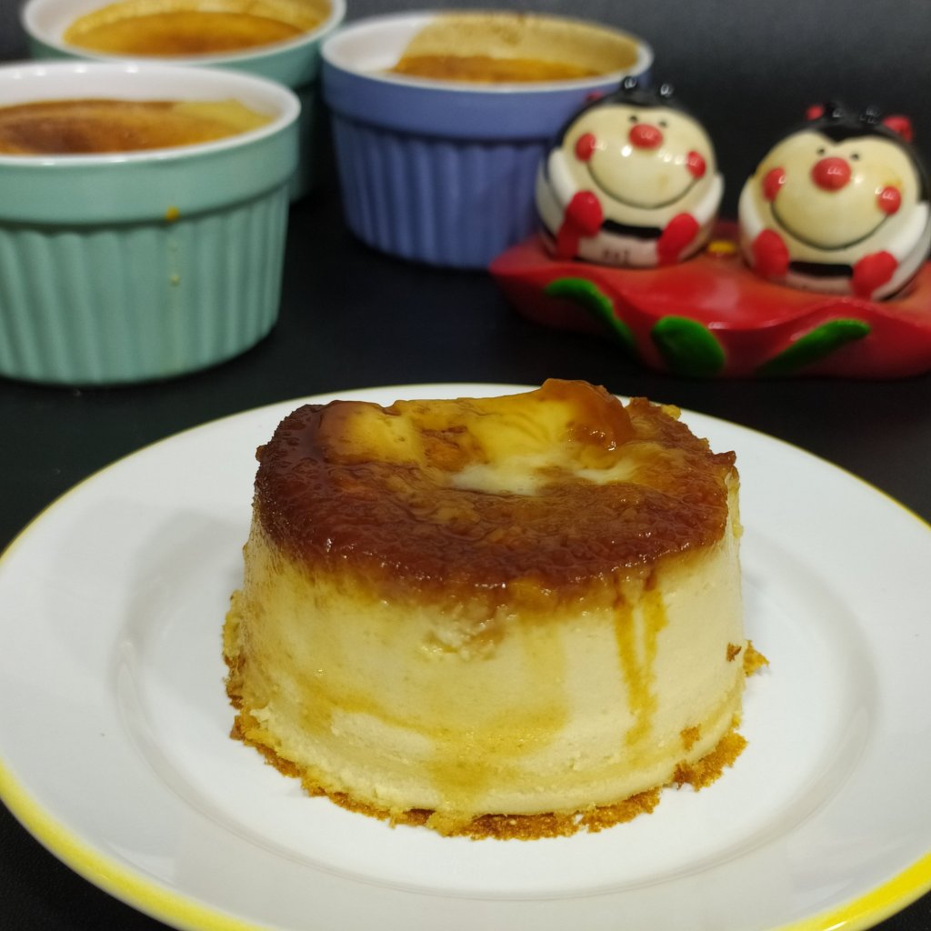 - Pon en las flaneras individuales una cucharadita de caramelo líquido, reparte la masa y la freidora de aire durante 12 minutos, a 180°. Deja enfriar.