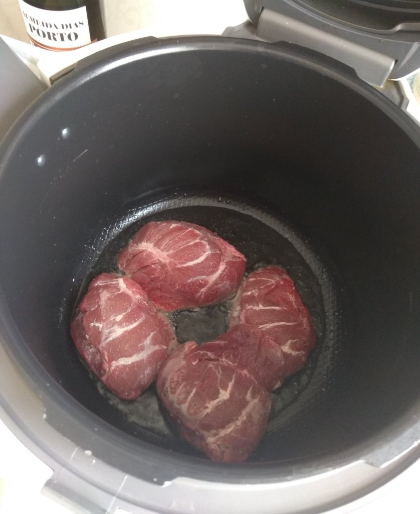 Ponemos a calentar en la olla rápida( yo las hago en la Cookeo de Moulinex) un poco de aceite de oliva virgen extra y, cuando esté bien caliente, freímos en el las carrilleras salpimentadas a fuego bastante fuerte, para que se sellen.