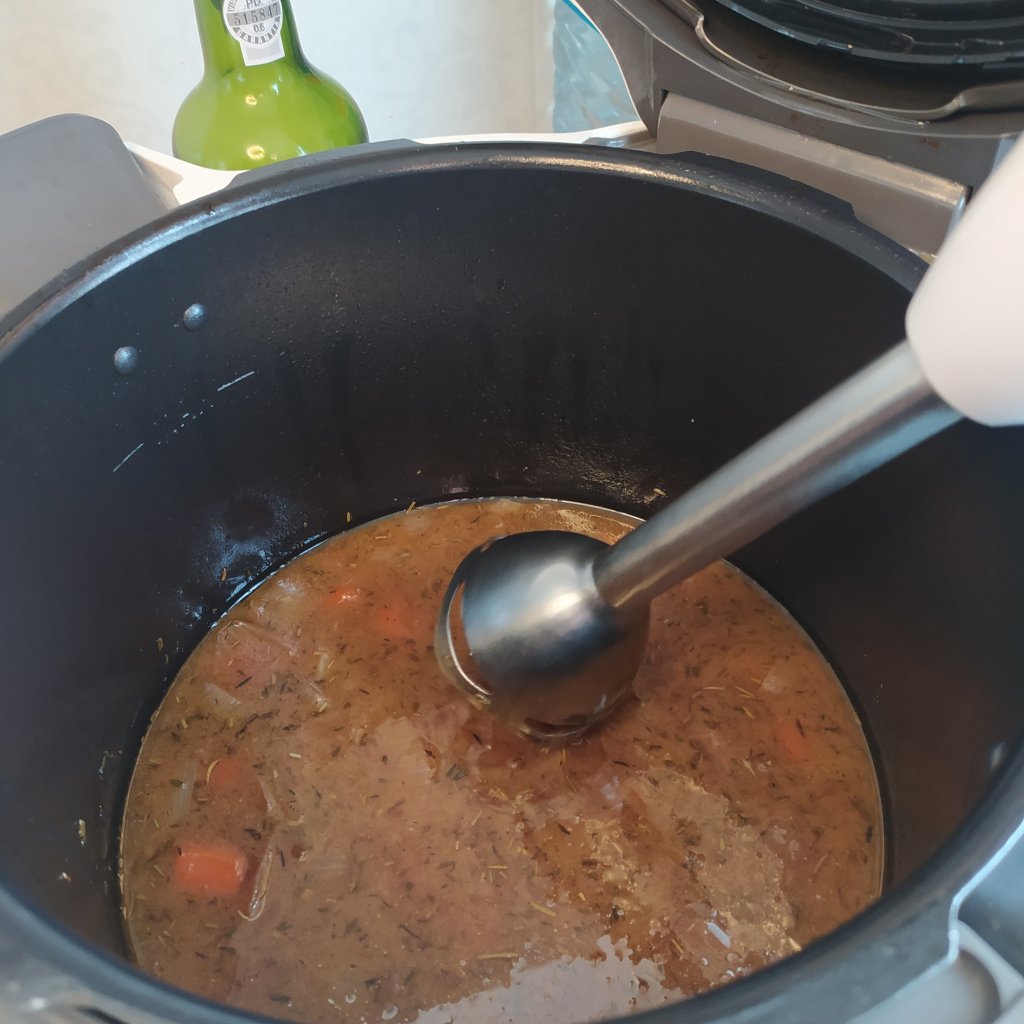 Cuando ha pasado el tiempo de cocción sacamos las carrilleras del caldo, desechamos el laurel y trituramos las verduras.