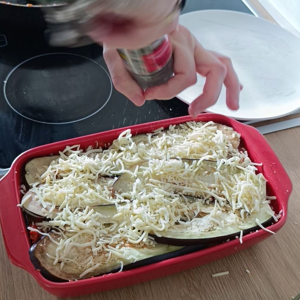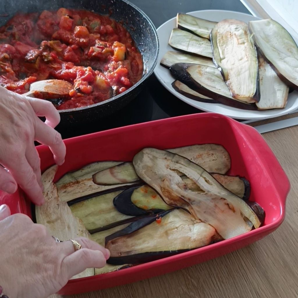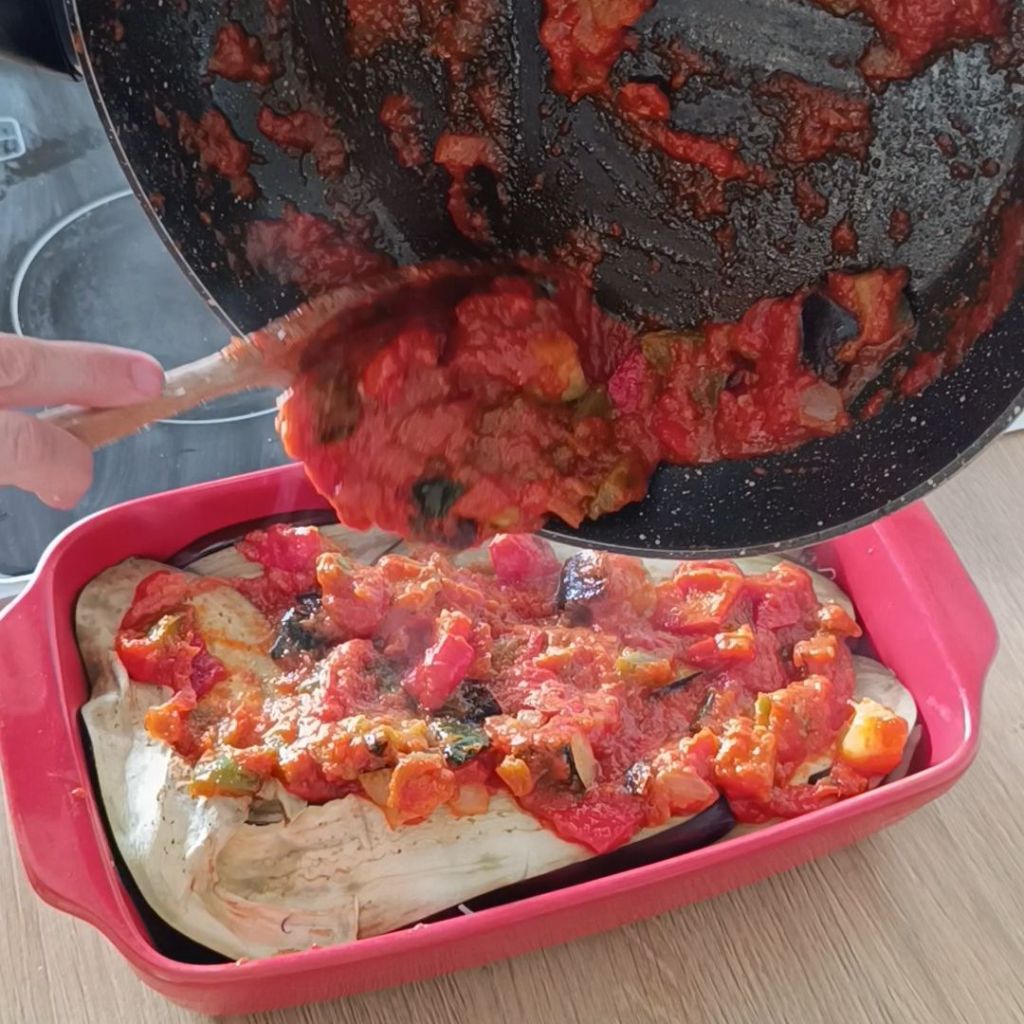 - Ponemos una capa de berenjena en el fondo
