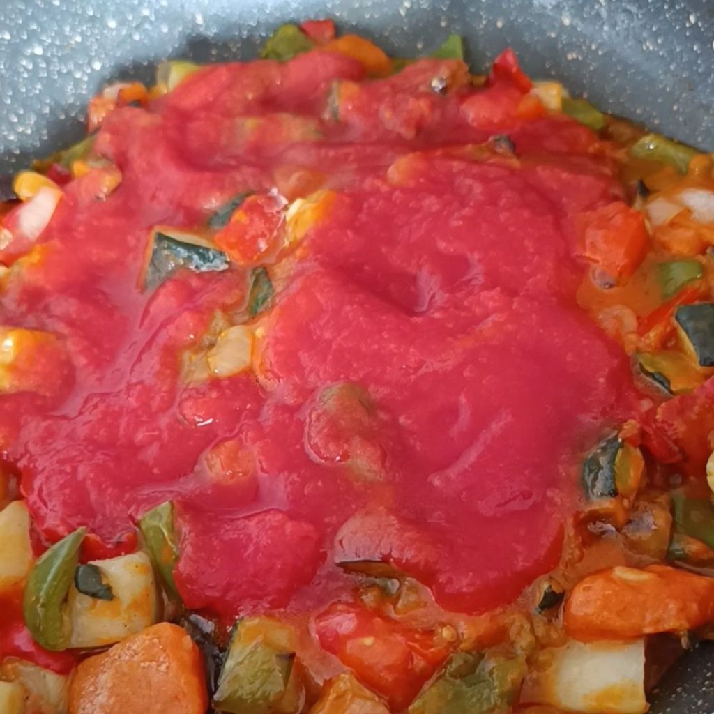 - Ponemos una sartén al fuego con un poco de aceite y una vez caliente agregamos el pisto congelado, cuando empiece a descongelar añadimos el tomate triturado, tapamos y dejamos cocinar a fuego medio 20 minutos. A media cocción probamos de sal y rectificamos si es necesario.