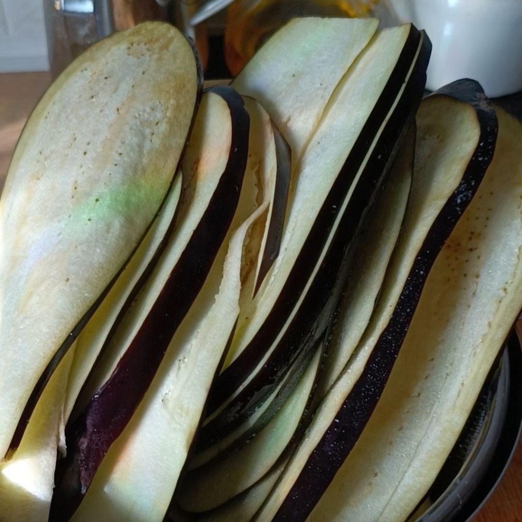 - Primero cortamos en rodajas las berenjenas y las ponemos en un recipiente grande o un colador y les ponemos sal, las dejamos 10 minutos que suden.
