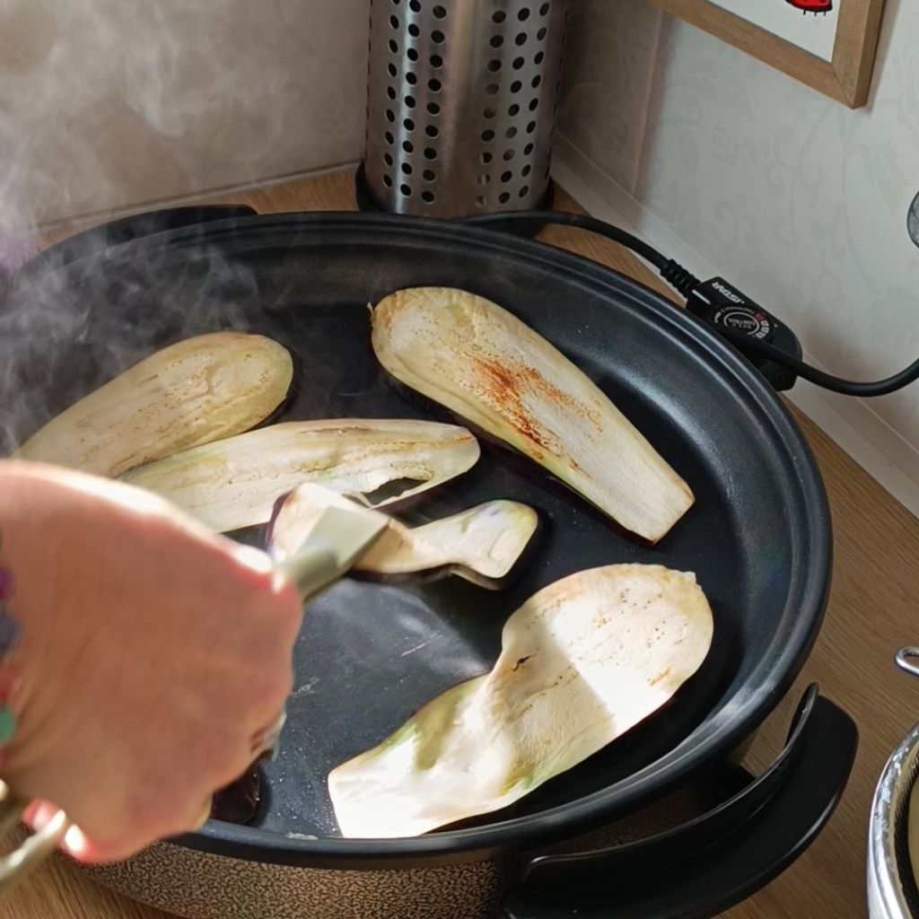 - Enjuagamos las berenjenas y las vamos pasando por la plancha y reservando.