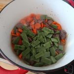 - Incorporamos las zanahorias peladas y cortadas a rodajas y las judías lavadas y cortadas en trocitos.