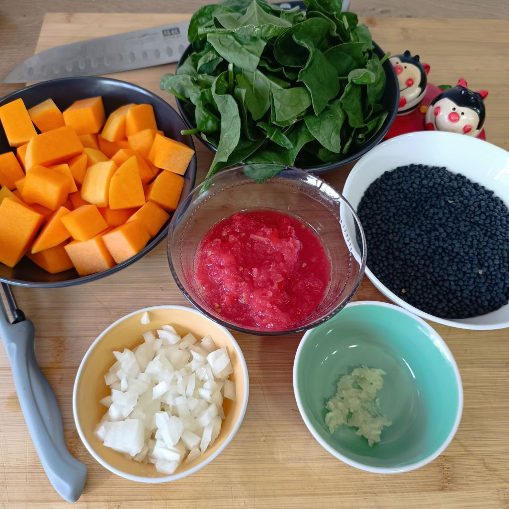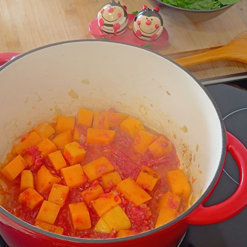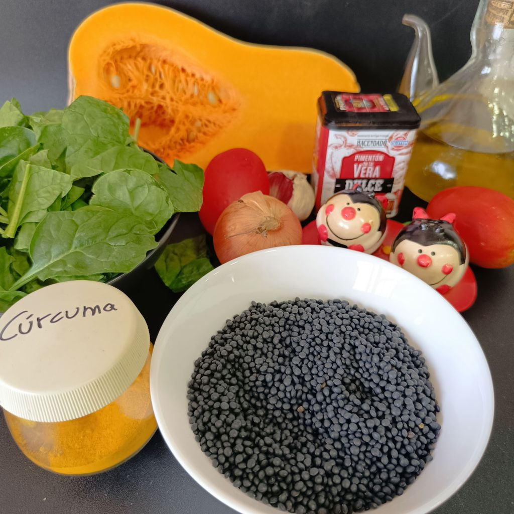 - Añade el pimentón, el tomate y sofríe durante otros 5 minutos. Añade las espinacas, la cúrcuma, las lentejas y el litro de agua o caldo.