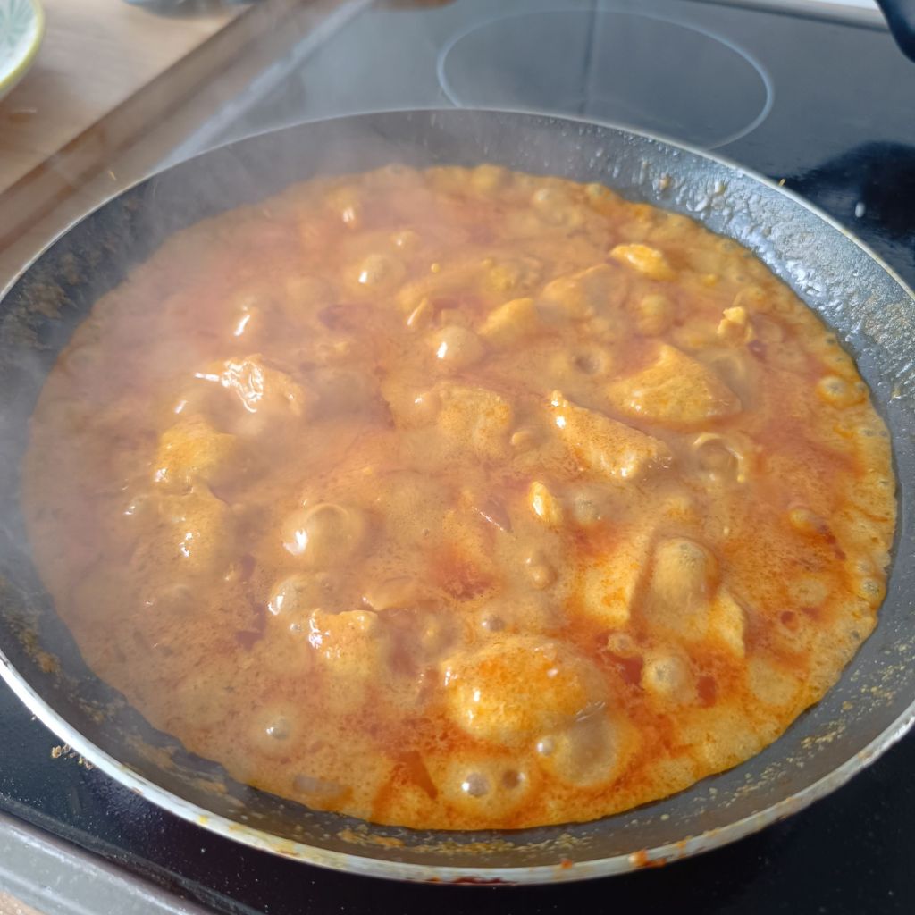 - Vuelve a añadir el pollo a la sartén y mezcla bien para que se impregne de la salsa. Cocina a fuego lento durante 10-15 minutos, hasta que el pollo esté bien cocido y la salsa haya espesado.