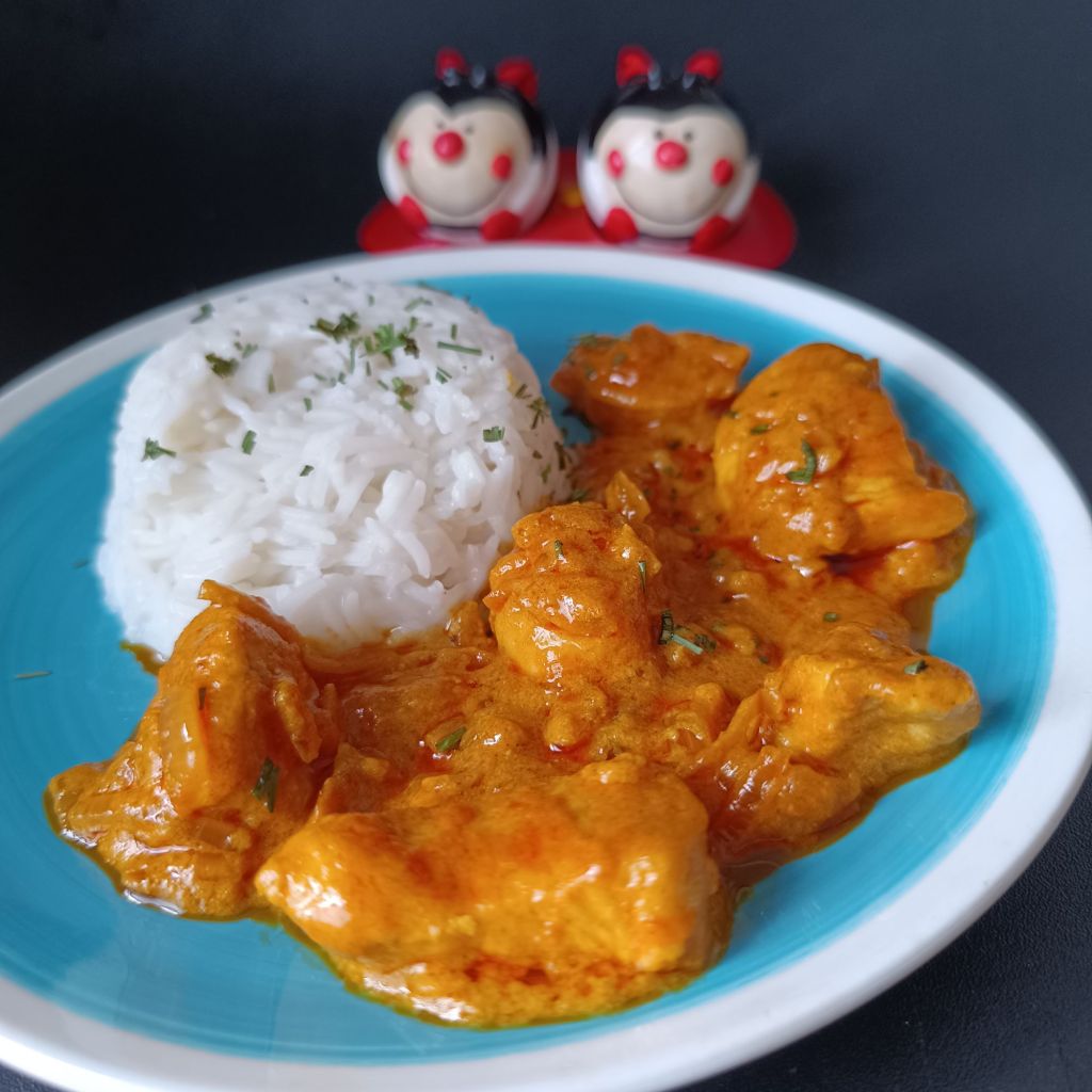 - Sirve el pollo al curry con arroz basmati o integral, o con pan naan para acompañar.