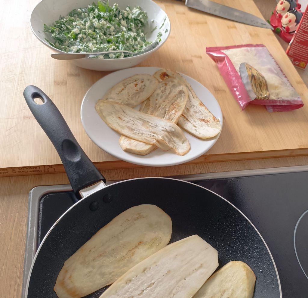 - Precalienta el horno a 180°C. Asa las rodajas de berenjena en una sartén con un poco de aceite de oliva hasta que estén suaves.