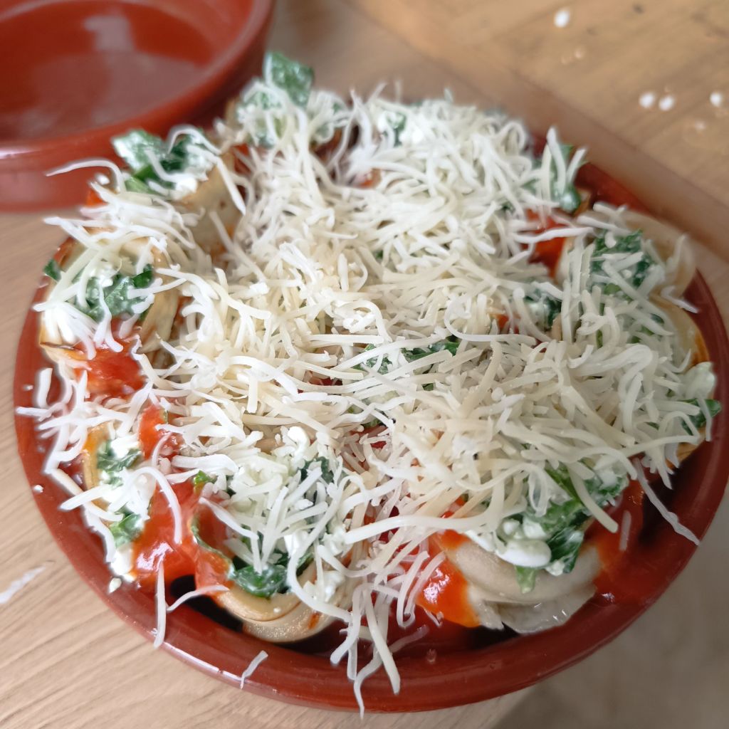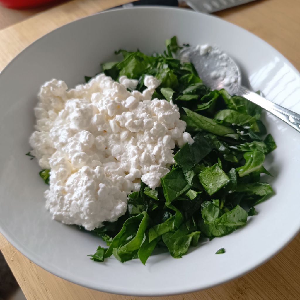 - En un bol, mezcla la ricotta con las espinacas picadas, ajo, sal y pimienta.