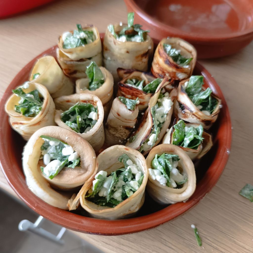- Coloca una cucharada de la mezcla de ricotta en cada rodaja de berenjena y enrolla.