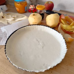 - Coloca la masa en un molde para tarta previamente engrasado, presionando bien los bordes y eliminando el exceso de masa.