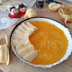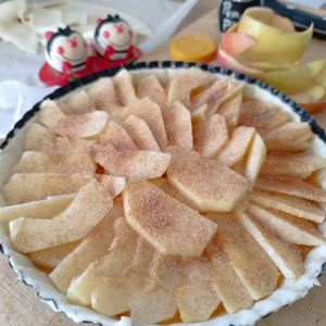 - Extiende una capa de compota o mermelada en la base. Coloca las láminas de manzana de manera uniforme sobre la tarta.