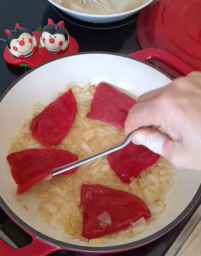 - Preparar la salsa: En una sartén grande, sofríe la cebolla y los ajos con un poco de aceite de oliva hasta que estén dorados. Añade la carne del pimiento choricero y los pimientos del piquillo. Cocina durante 5 minutos para que los sabores se mezclen.