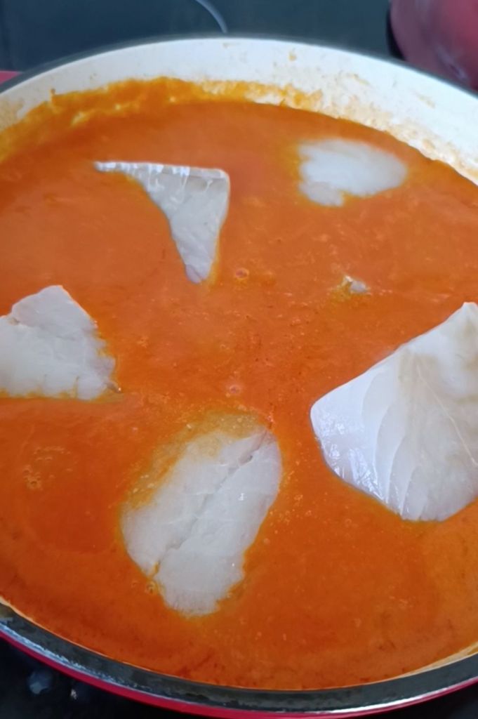 - Cocinar el bacalao: Coloca los lomos de bacalao en la salsa, con la piel hacia abajo, y cocina a fuego lento durante 5 minutos o hasta que estén tiernos.