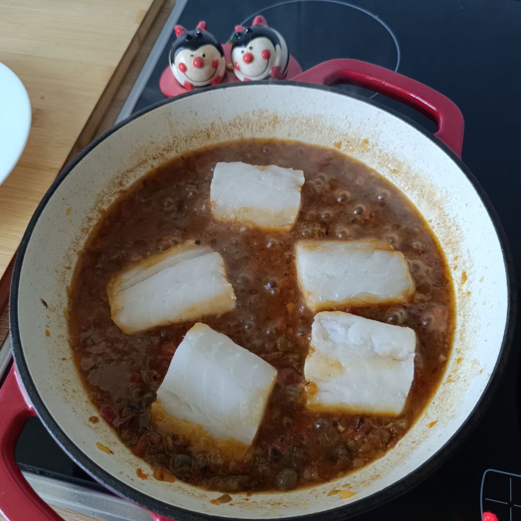 - Empuja el sofrito a un lado de la sartén y coloca los lomos de bacalao, con la piel hacia abajo si la tienen. Cocina unos 3-4 minutos por cada lado, tapando la sartén para que se hagan al vapor suave.